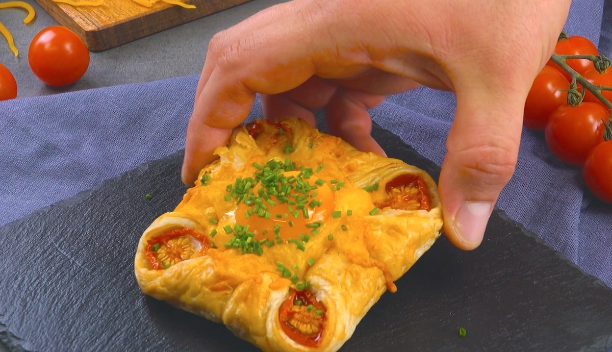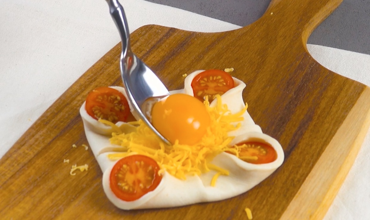 3.2 Rabattez maintenant les coins vers les tomates cerises. Mettez un peu de cheddar au milieu et un jaune d’œuf par-dessus.
