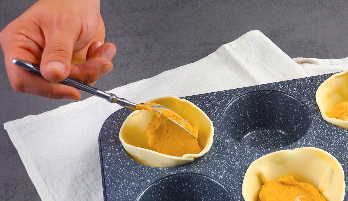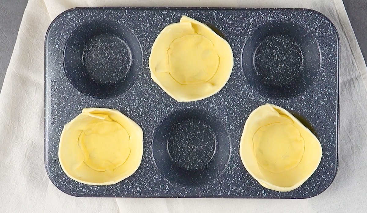 2.1 Graissez un moule à muffins et recouvrez les bords de trois cavités d’une bande de pâte feuilletée, les extrémités devant se chevaucher. Posez ensuite un morceau rond de pâte feuilletée sur le fond de chaque moule ; si nécessaire, pressez légèrement les bords.