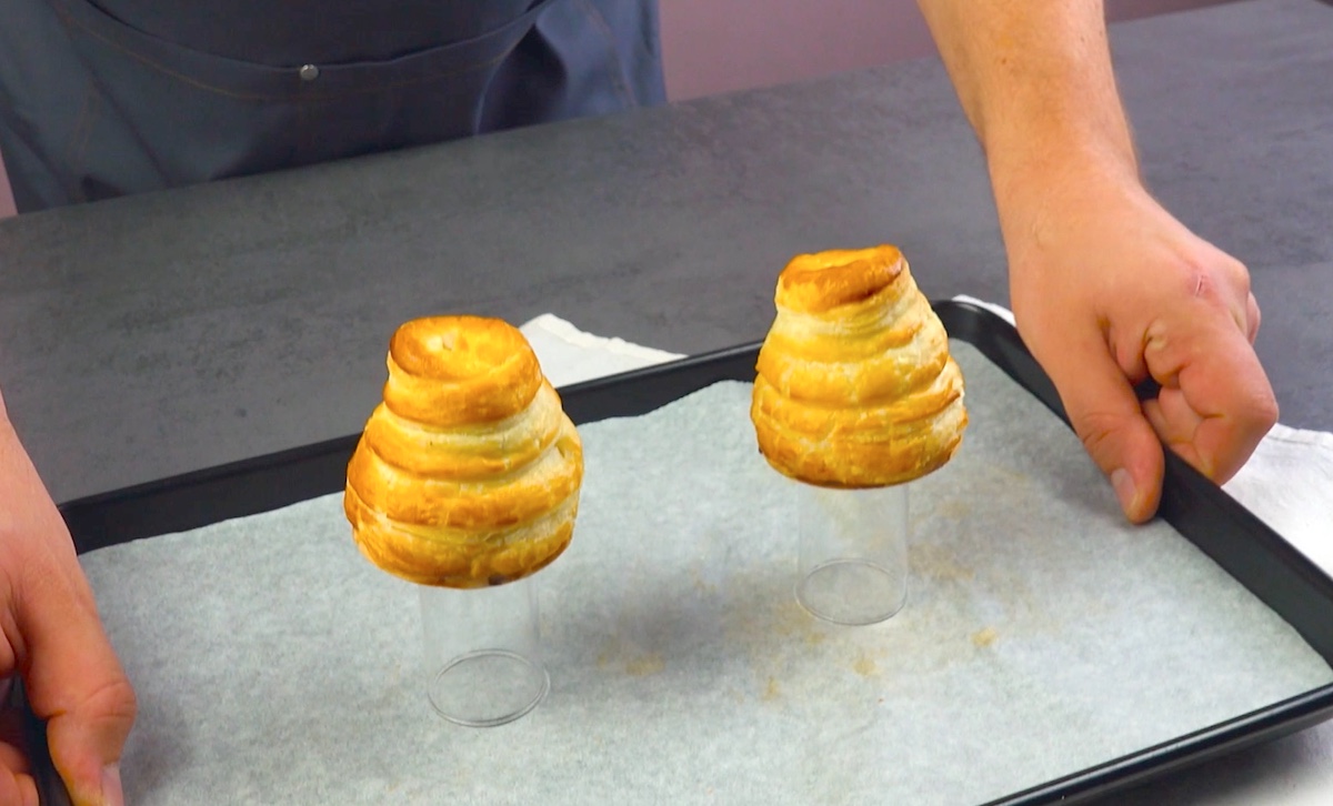 1.1 Entourez chaque cornet de glace de deux bandes de pâte feuilletée et placez-les, ouverture vers le bas, sur des verres à shot. Battez les jaunes d’œufs avec un peu de lait et badigeonnez la pâte feuilletée de ce mélange. Faites cuire le tout pendant 15 minutes à 180 °C à chaleur tournante et laissez ensuite refroidir.