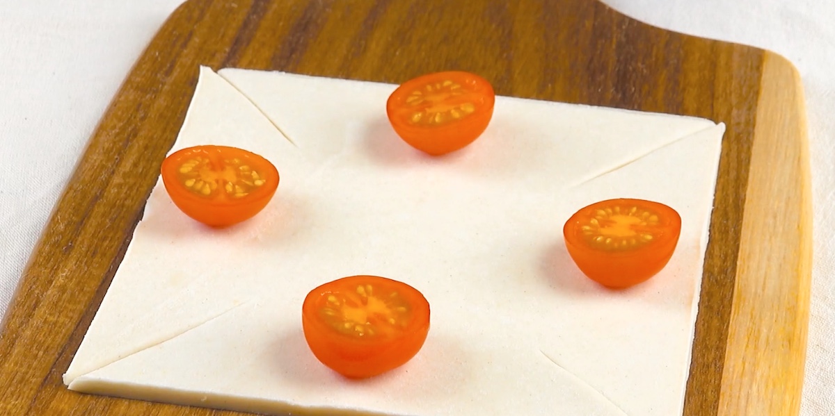 3.1 Incisez la pâte feuilletée dans les coins sur environ 3 cm en direction du centre. Coupez les tomates cerises en deux et placez une moitié au milieu de chaque entaille.