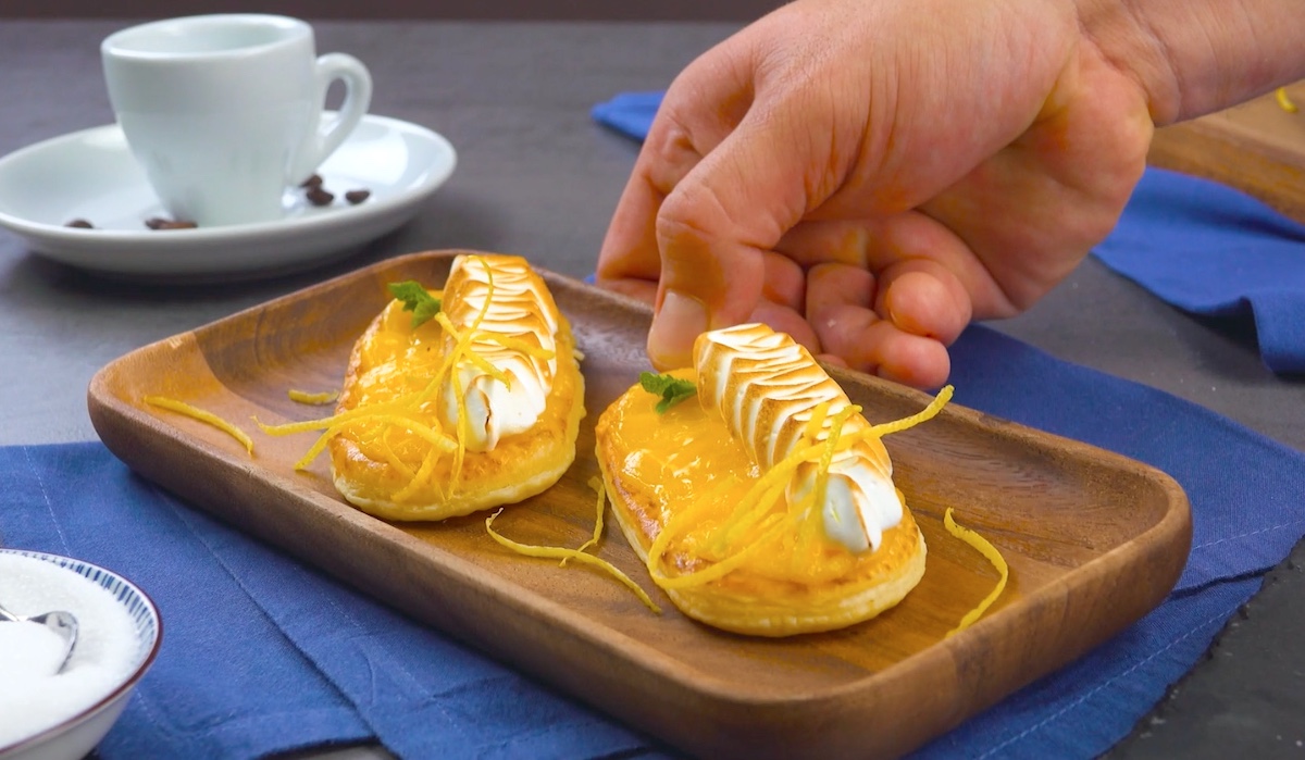 4.3 Pour la meringue, montez les blancs d’œufs et le sel en neige, puis ajoutez lentement le sucre. Battez la meringue jusqu’à ce qu’elle soit bien lisse, puis versez-la dans une poche à douille et répartissez-la sur les barques au citron. Faites flamber la meringue avec un chalumeau de cuisine et servez les barques de pâte feuilletée au citron, garnies de zeste de citron et de menthe.