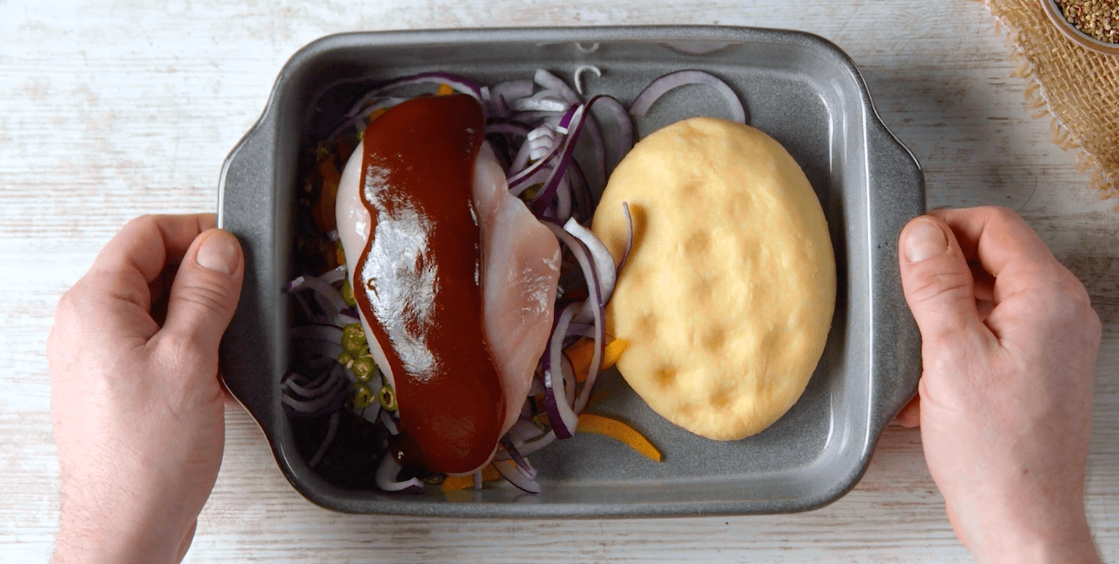 3.2 Tranchez finement les poivrons, les oignons et les piments et remplissez l’autre moitié du plat, puis déposez les blancs de poulet dessus et recouvrez-les de sauce BBQ.