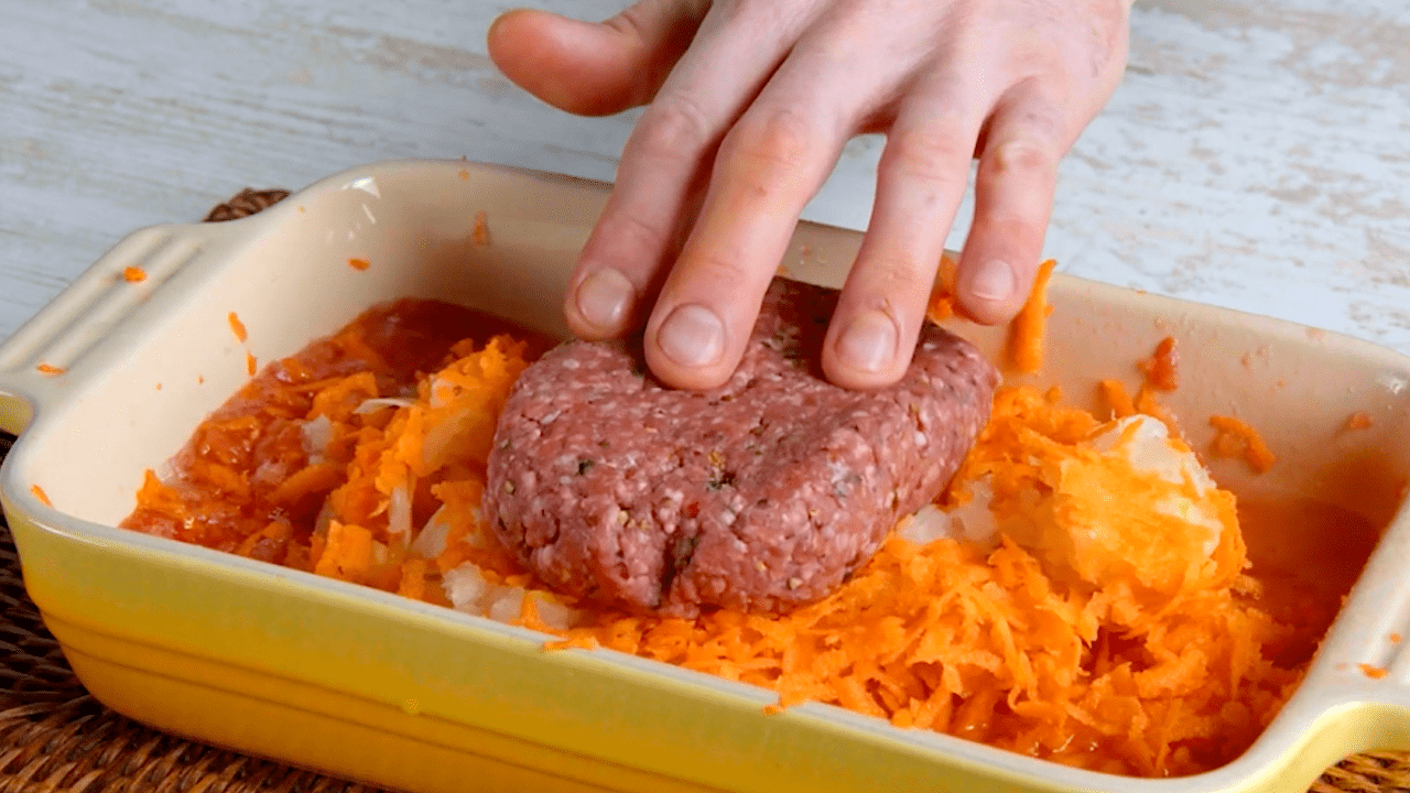 4.1 Râpez les tomates, les carottes et les oignons dans un plat à gratin.