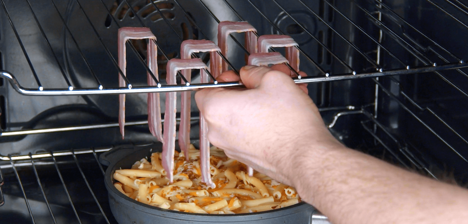 2.4 Faites maintenant cuire le mélange de pâtes au fromage avec les tranches de bacon suspendues au-dessus pendant 15 minutes à 180 °C en mode convection.
