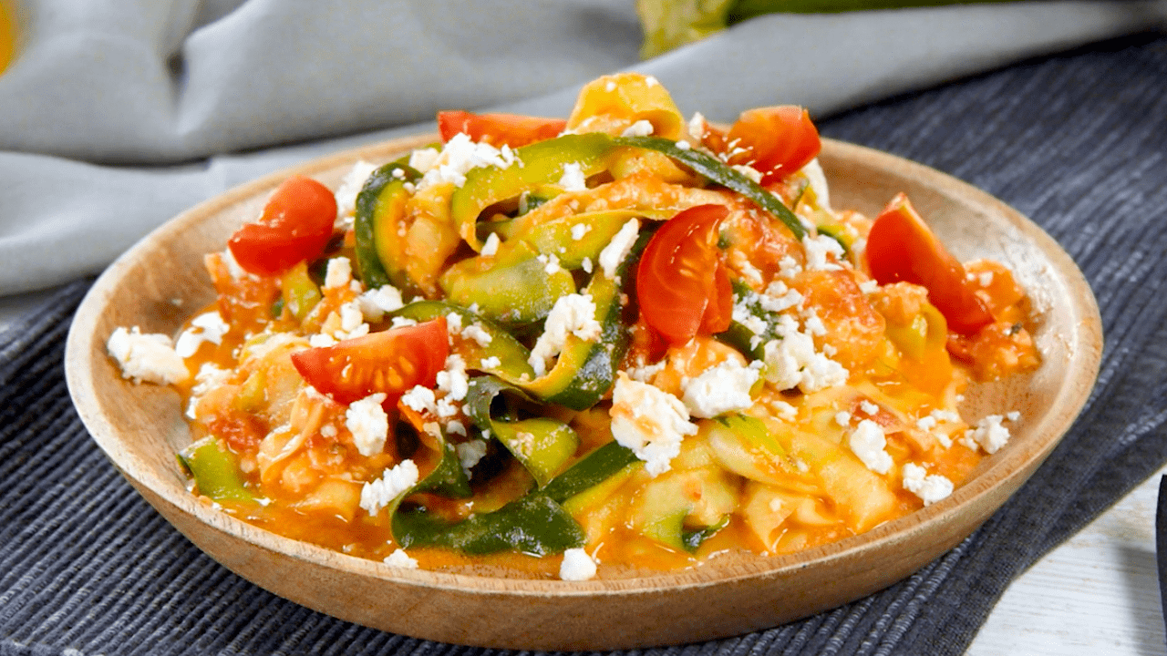 1.3 Coupez les courgettes en longues lanières fines et mélangez-les avec la sauce. Avant de servir, garnissez les zoodles d’herbes fraîches, de tomates et de feta, si vous le souhaitez.