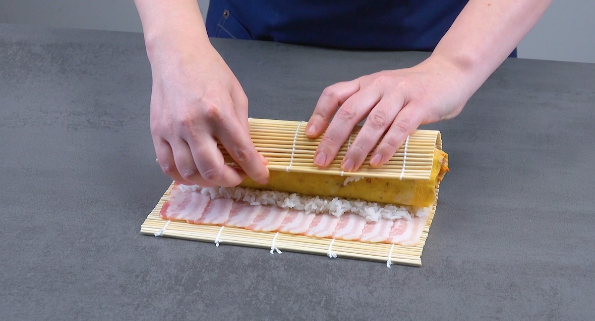 4.4 Placez le rouleau d’œuf au milieu du riz et enroulez-le à l’aide de la natte à sushi.