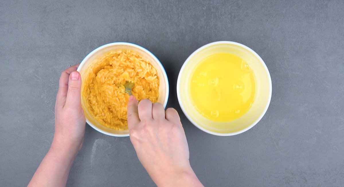 3.1 Mélangez les jaunes d’œufs avec le riz cuit et assaisonnez avec du sel et du poivre.