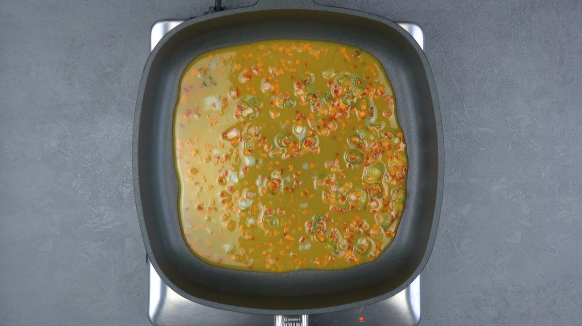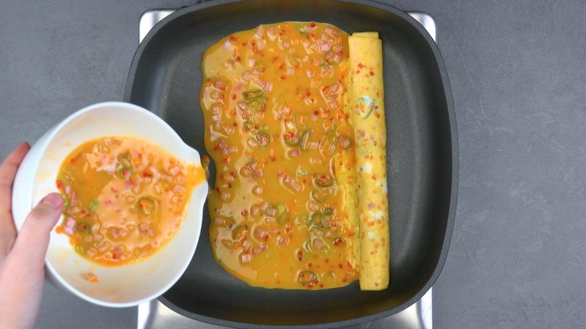 4.1 Battez les œufs, mélangez-les avec le jambon blanc, l’oignon nouveau, la carotte et le piment et assaisonnez avec du poivre et du sel. Graissez légèrement une poêle et préchauffez-la à feu moyen. Versez une couche très fine du mélange d’œufs dans la poêle et attendez que l’œuf ait cuit.