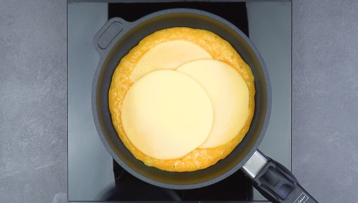 2.2 Graissez légèrement la poêle et préchauffez-la à feu moyen. Versez ensuite le jaune d’œuf dans la poêle, attendez qu’il durcisse et placez les tranches de fromage sur une extrémité, comme montré ci-dessous.