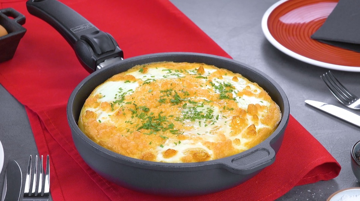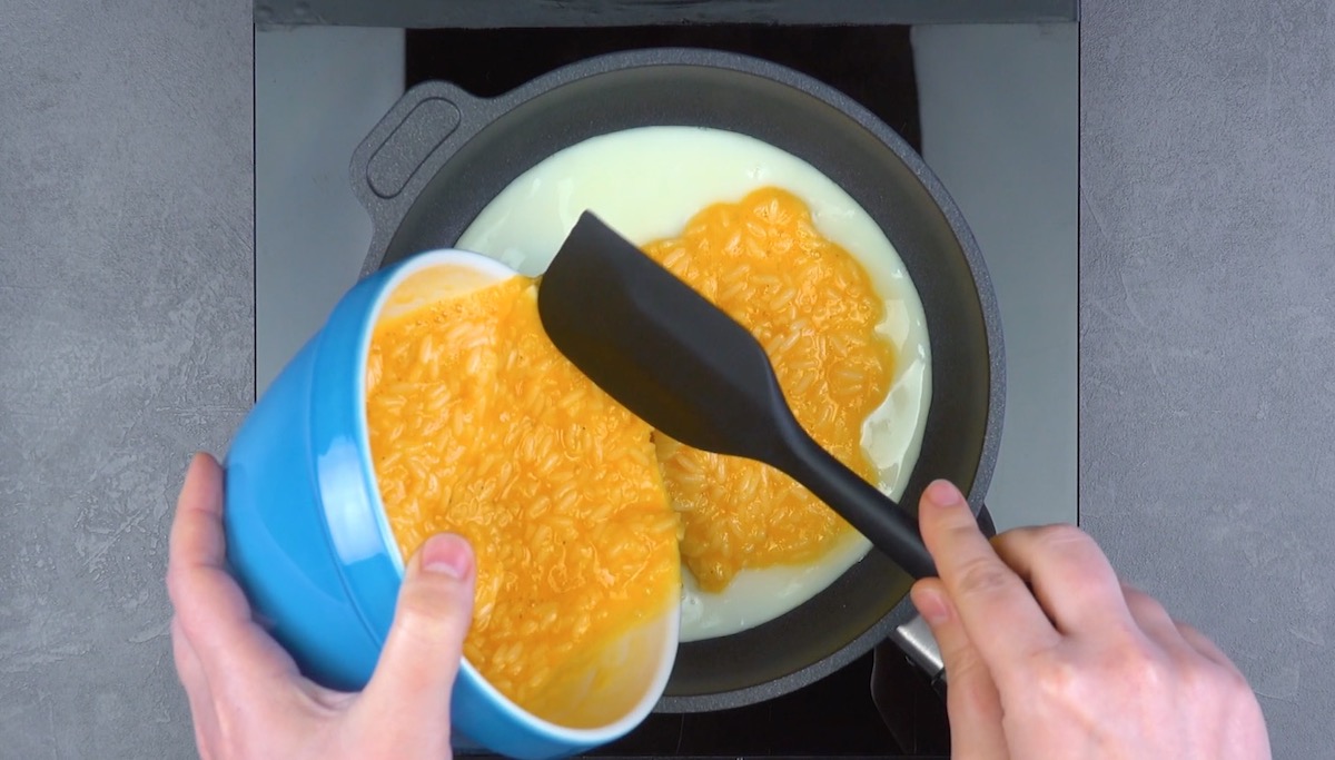 3.2 Versez la moitié des blancs d’œufs dans une poêle en fonte légèrement préchauffée et graissée et attendez qu’ils soient presque complètement cuits. Versez ensuite la moitié du mélange de jaune d’œuf et de riz par-dessus.