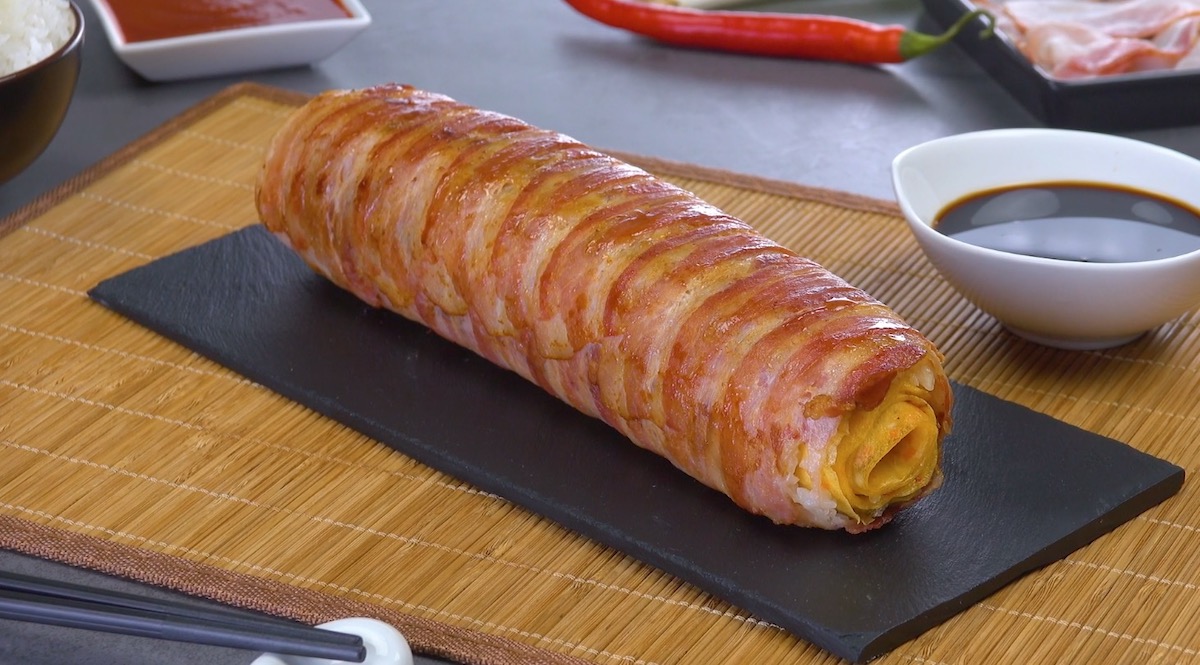 4.5 Faites revenir le rouleau de sushi enveloppé de lard dans la poêle jusqu’à ce qu’il soit croustillant.