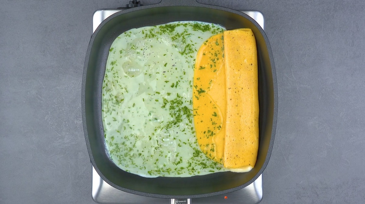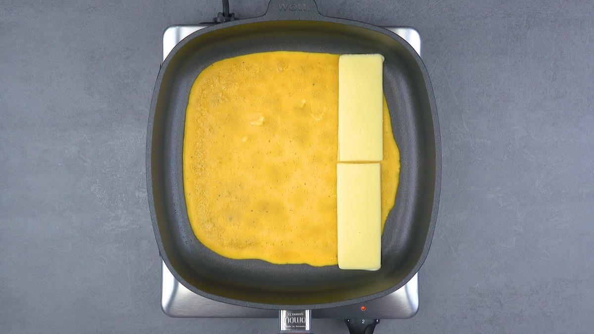 2.3 Enveloppez maintenant le fromage dans le jaune d’œuf, en laissant un bord libre. Poussez le rouleau jusqu’au bord de la poêle et versez le blanc d’œuf sur l’extrémité du rouleau ; veillez à verser suffisamment de blanc d’œuf sur le bord du rouleau pour que les deux tiennent ensemble.