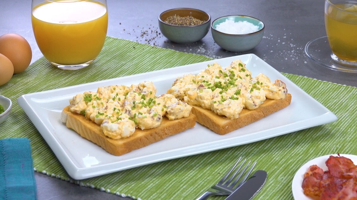 1.3 Versez votre salade d’œufs sur les tranches de pain de mie grillées et saupoudrez de ciboulette avant de servir.