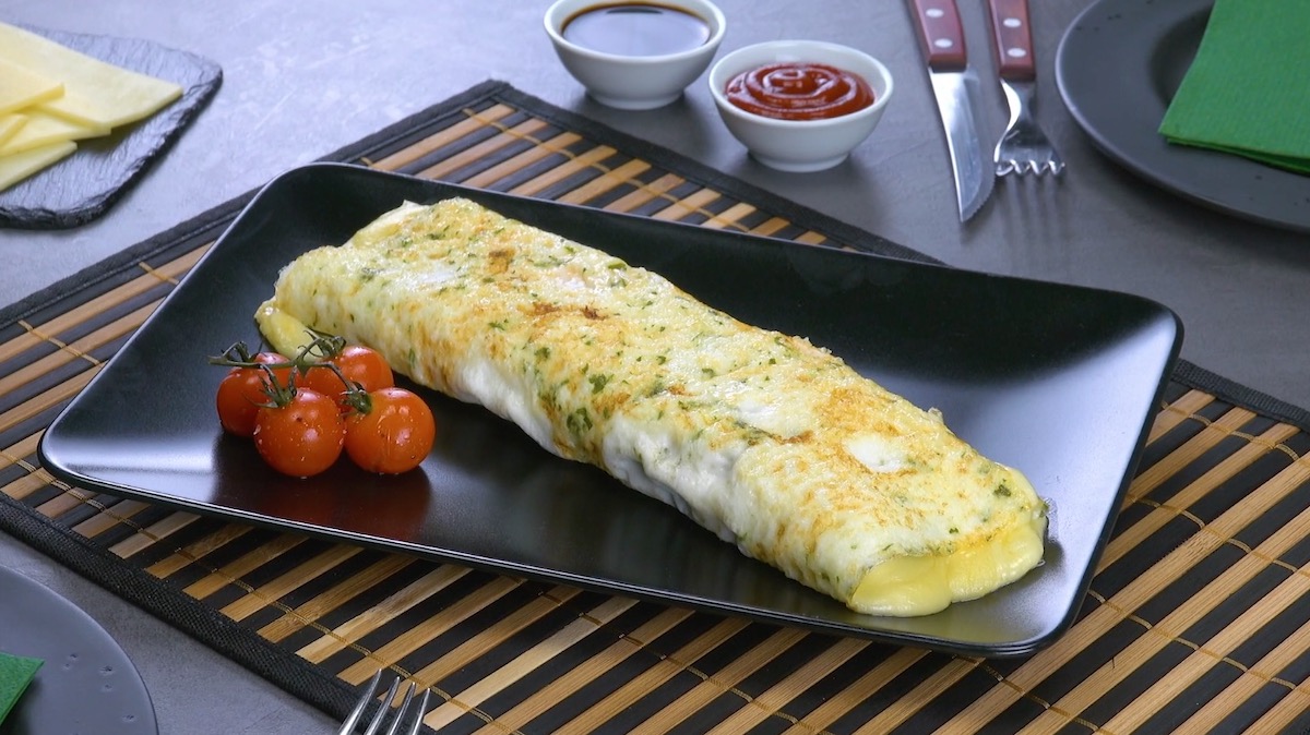 2.4 Continuez à rouler l’omelette une fois que le blanc d’œuf a durci. Servez l’omelette au fromage bien chaude pour apprécier son cœur coulant.