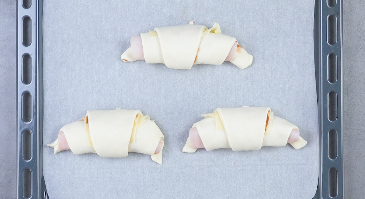 2.2 Roulez les triangles à partir du côté large pour créer la forme typique d’un croissant. Placez les croissants sur une plaque de cuisson recouverte de papier sulfurisé et enfournez à 220 °C pendant 15 à 20 minutes, à chaleur tournante.