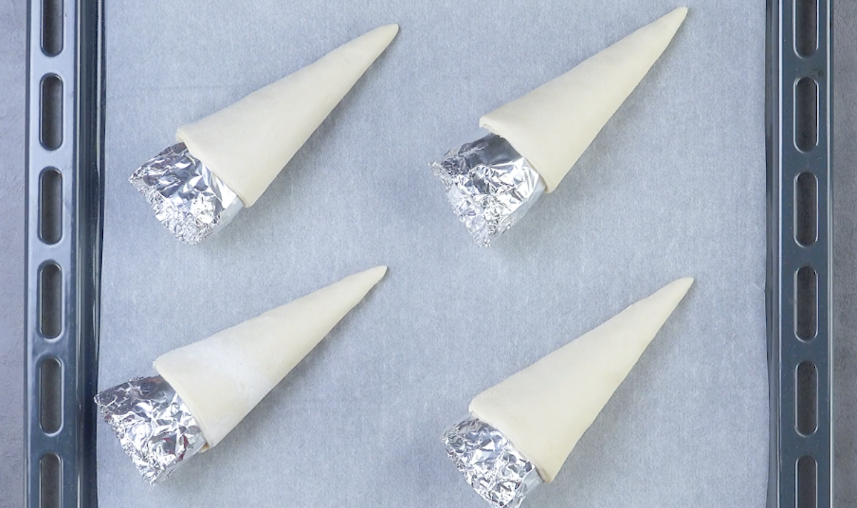 4.2 Étalez finement la pâte et découpez un grand cercle (utilisez un bol). Divisez la pâte en quatre puis enroulez-la autour des cornets en aluminium. Badigeonnez les extrémités avec de l’eau pour que le cône reste collé. Placez les cornets sur une plaque de cuisson recouverte de papier sulfurisé et enfournez-les à 220 °C pendant 15 minutes, à chaleur tournante. Retirez la feuille d’aluminium après la cuisson.