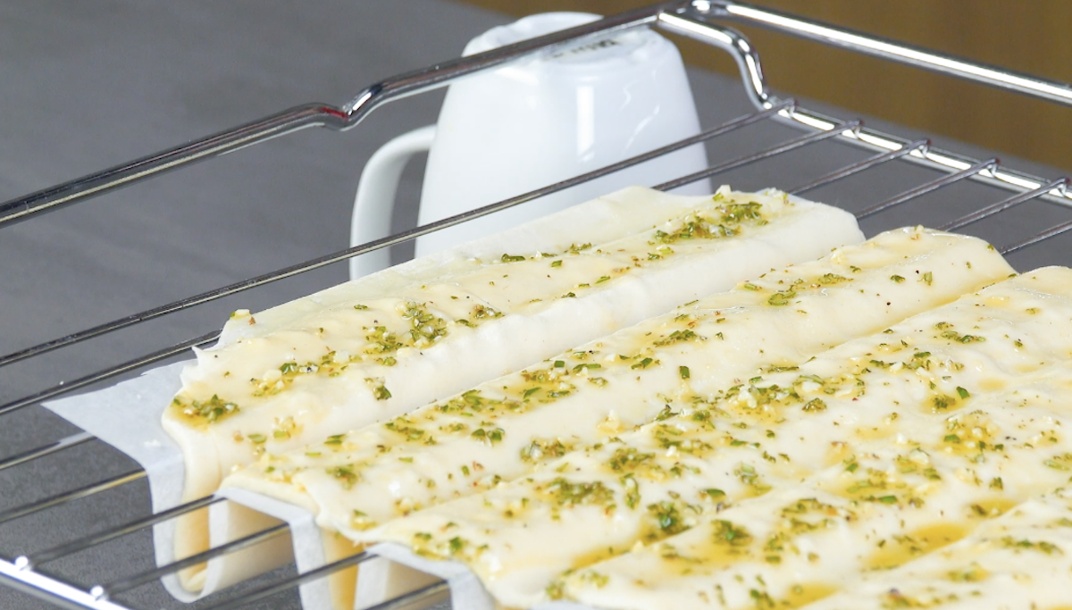 5.2 Recouvrez le tout avec le deuxième rectangle de pâte. Mélangez l’ail avec le romarin et l’huile d’olive et badigeonnez-en la pâte. Enfournez le tout à 220 °C pendant environ 15 à 20 minutes, à chaleur tournante.