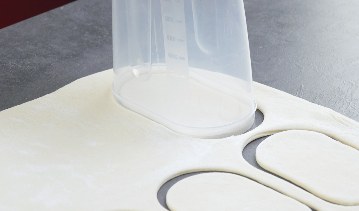 3.1 Étalez finement la pâte à pizza et à l’aide d’un moule, nous avons utilisé un Tupperware, découpez la pâte 6 fois.