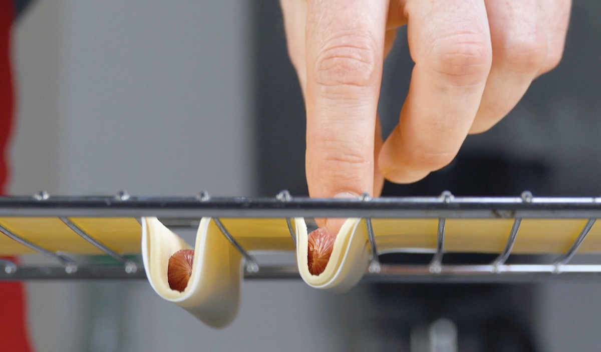 5.1 Étalez finement la pâte de manière à obtenir 2 rectangles de même taille. Placez un rectangle sur une grille surélevée recouverte de papier sulfurisé. Pressez un mini-salami dans un espace sur deux et râpez du fromage par-dessus.