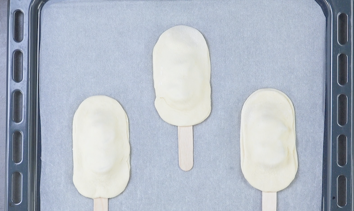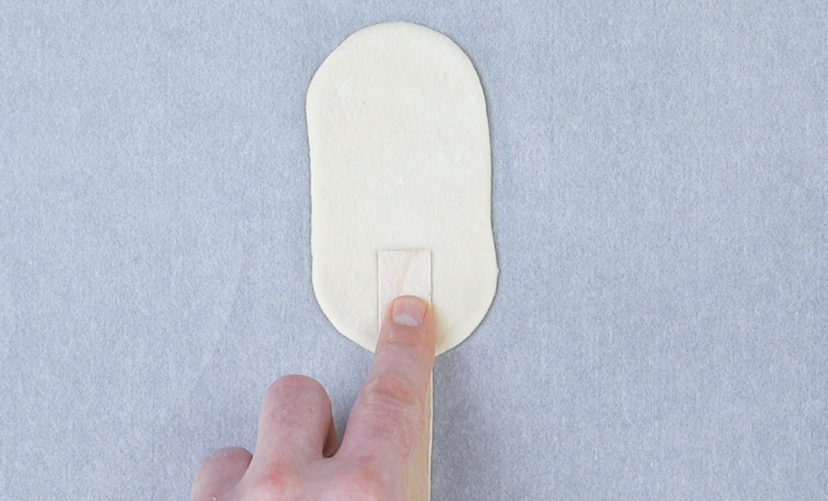 3.2 Placez les pâtes sur une plaque de cuisson recouverte de papier sulfurisé et enfoncez un bâtonnet en bois dans la pâte sur la face inférieure.