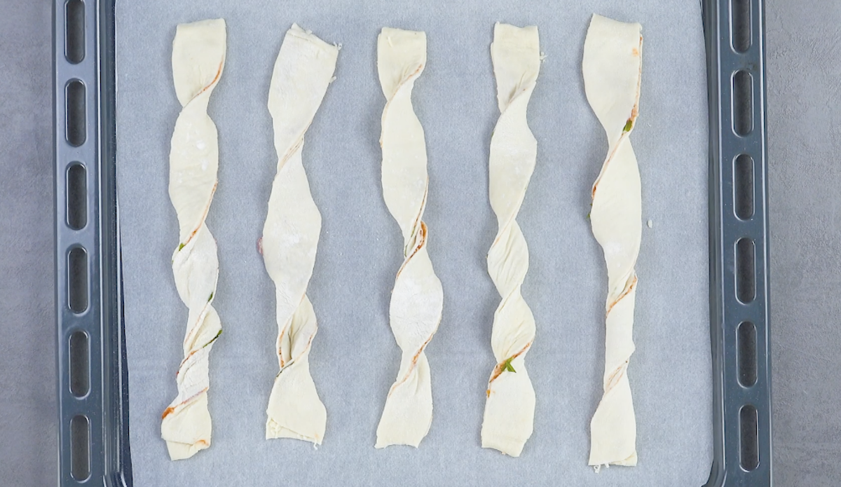 1.2 Placez le deuxième rectangle de pâte sur le premier et appuyez fermement dessus. Coupez le tout en bandes d’environ 2 cm de large et entortillez-les des deux côtés. Placez vos préparations sur une plaque de cuisson recouverte de papier sulfurisé. Enfournez à 220 °C pendant 15 minutes, à chaleur tournante.