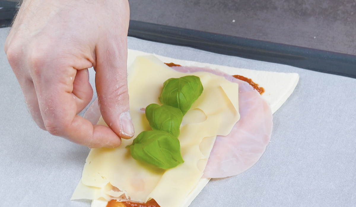 2.1 Étalez finement la pâte et coupez-la en grands triangles. Étalez la sauce tomate sur un triangle et déposez le jambon, le fromage et le basilic sur le dessus.
