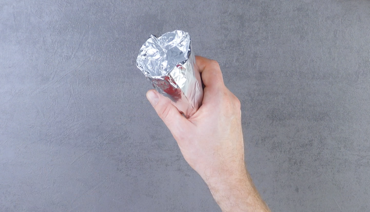 4.1 Enveloppez les cornets de glace dans du papier aluminium. Retirez ensuite les cornets de manière à ce que obteniez la forme d’un cornet avec le papier aluminium. Repliez un peu le bord pour que la forme tienne bien.