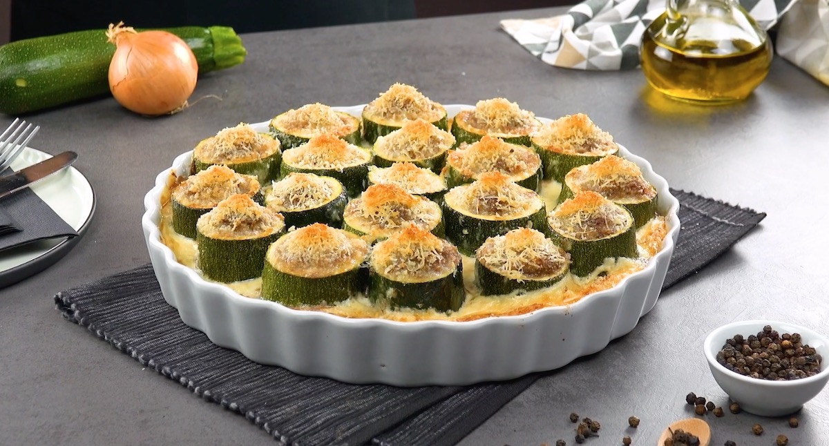 Les plats cuits au four sont pratiquement toujours délicieux. Aujourd’hui, nous vous présentons un gratin composé de courgettes farcies de viande hachée et nappées d’une sauce crémeuse qui a tout ce qu’il faut pour faire un tabac.