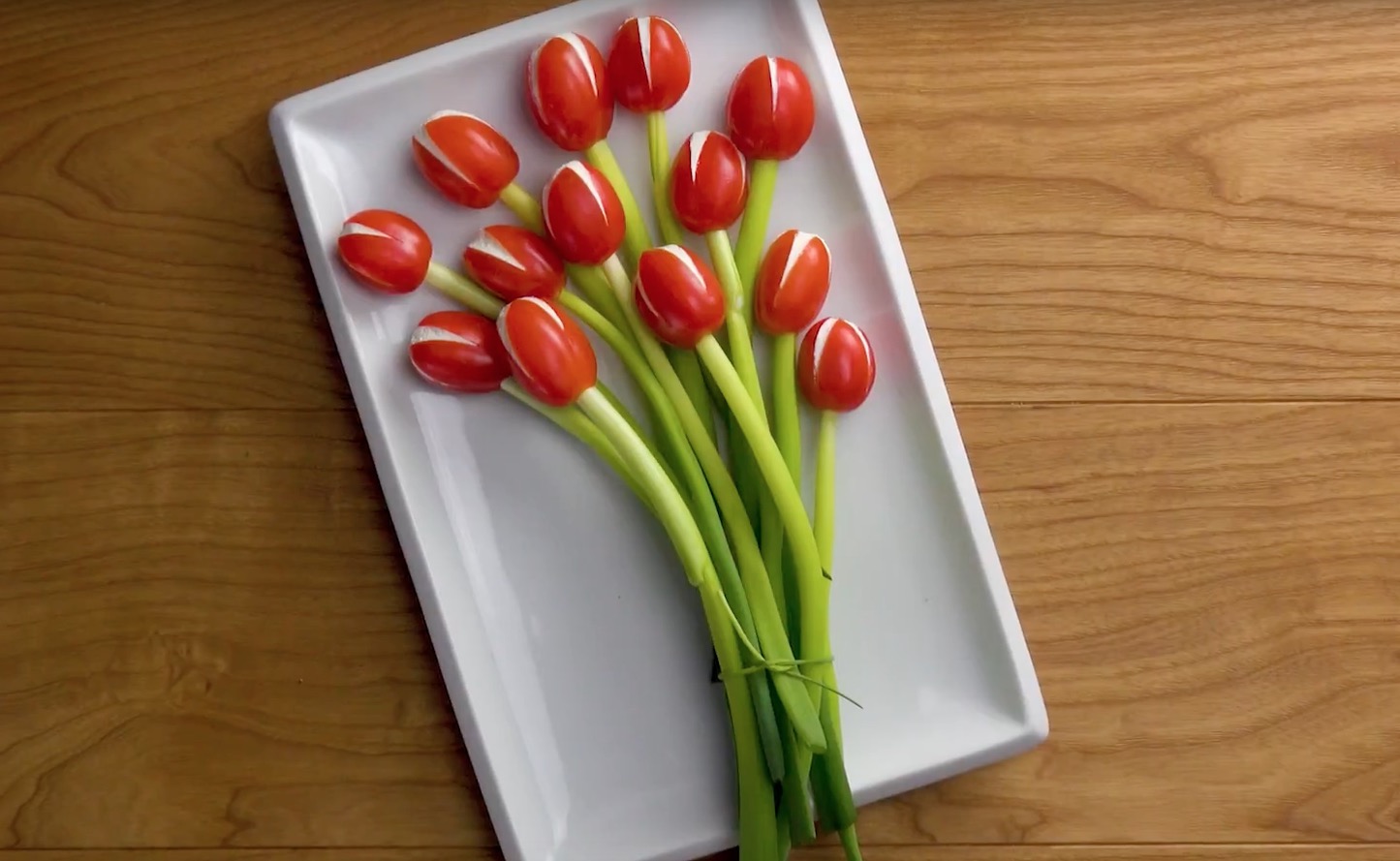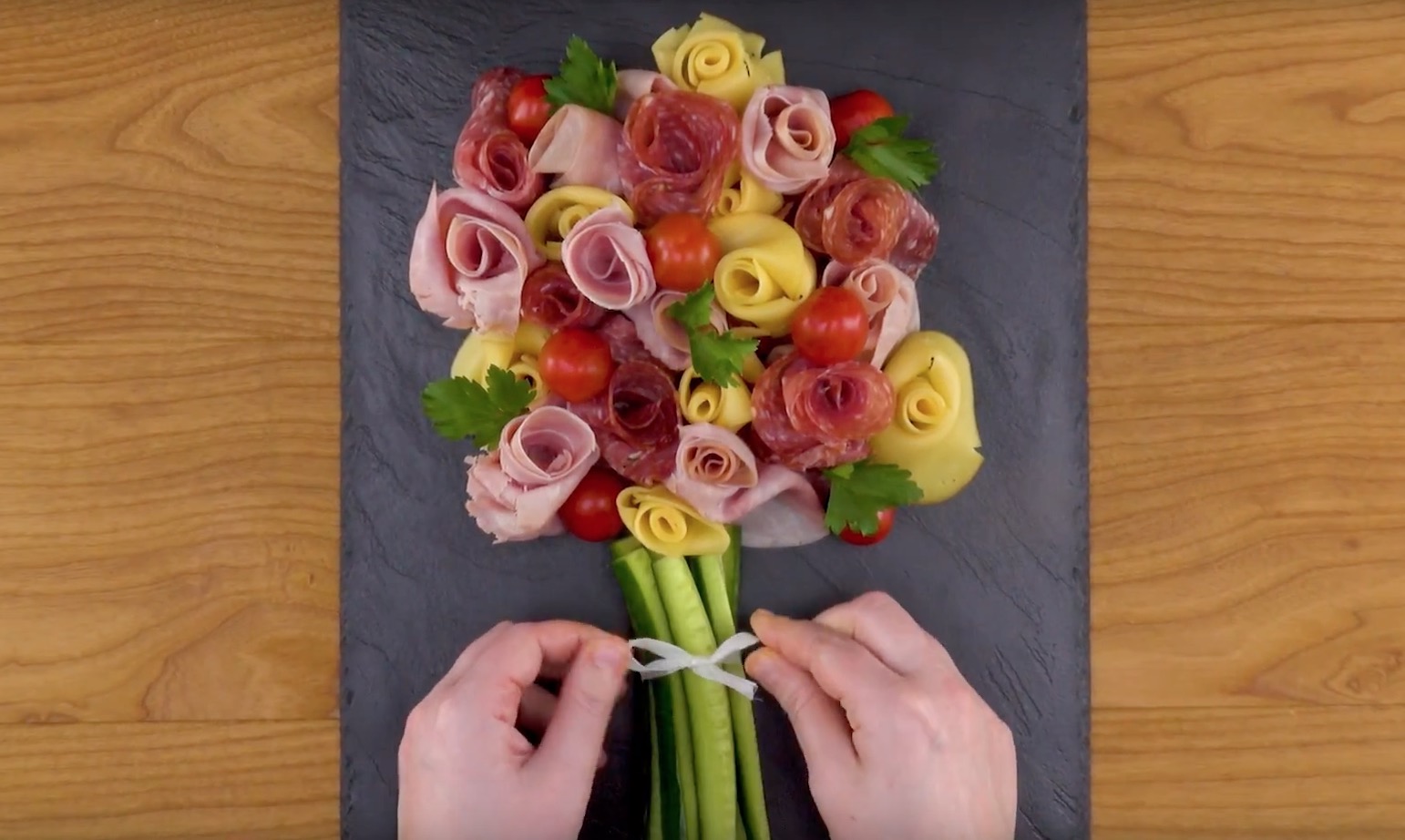 - Rassemblez-les comme un bouquet sur la partie supérieure d’une assiette plate. Parsemez le bouquet de tomates cerises. Pour parfaire l’ensemble, ajoutez des feuilles de persil entre les roses.
