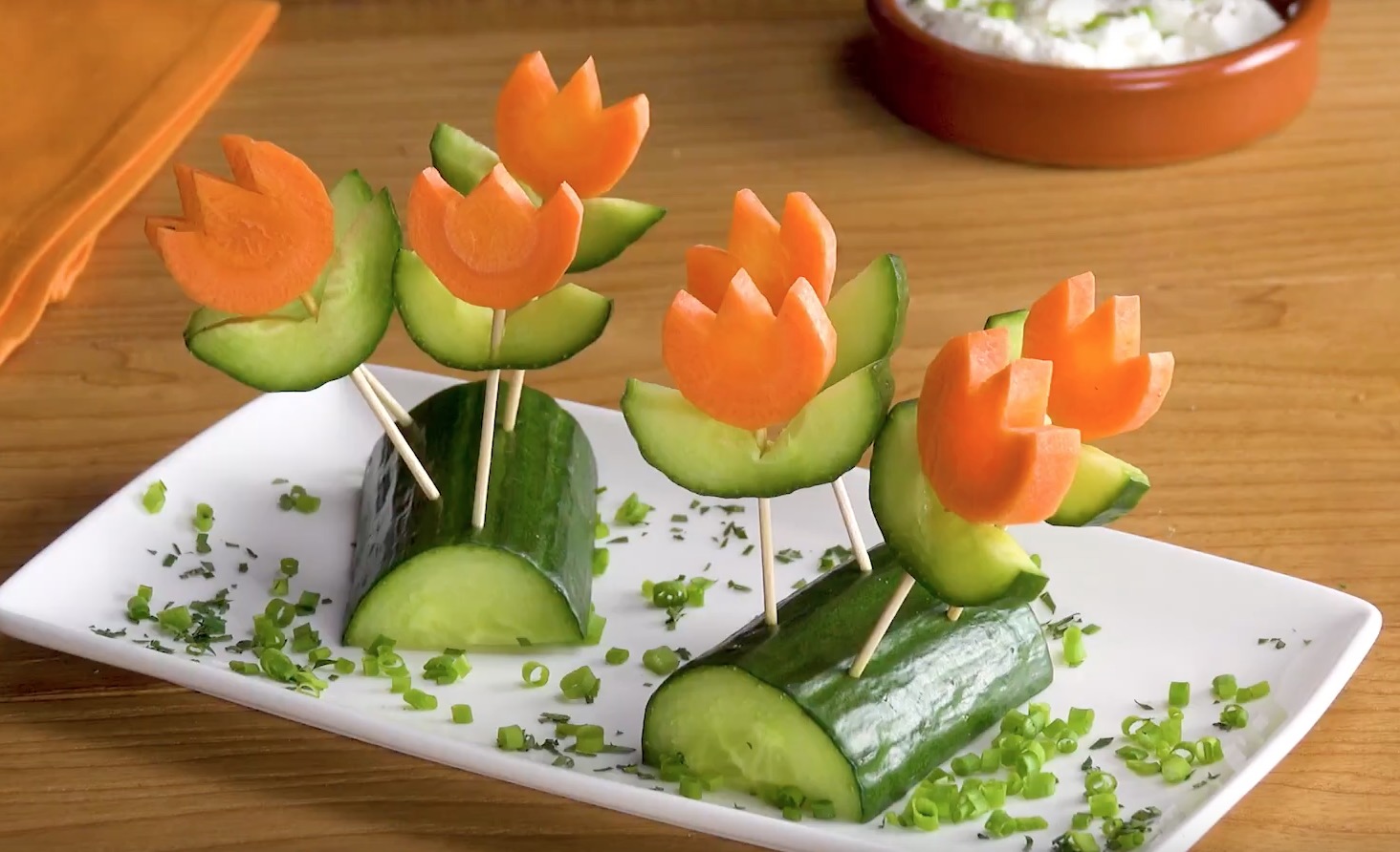 - Enfoncez chaque tranche de concombre sur un cure-dents. Par dessus, enfoncez une tranche de carotte afin de formez des fleurs.