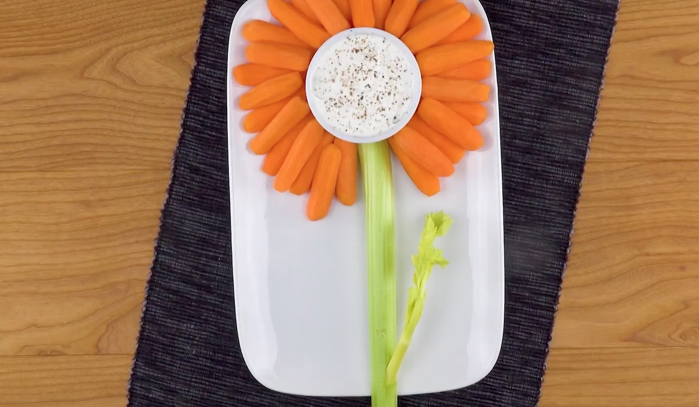 - Coupez les carottes en deux dans le sens de la largeur puis à nouveau en deux dans le sens de la longueur. Disposez-les autour du bol pour former les pétales d’un tournesol.