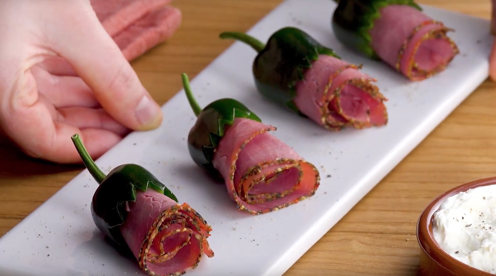 - Roulez les tranches de dinde sur elles-mêmes et insérez-les dans les jalapeños coupés.