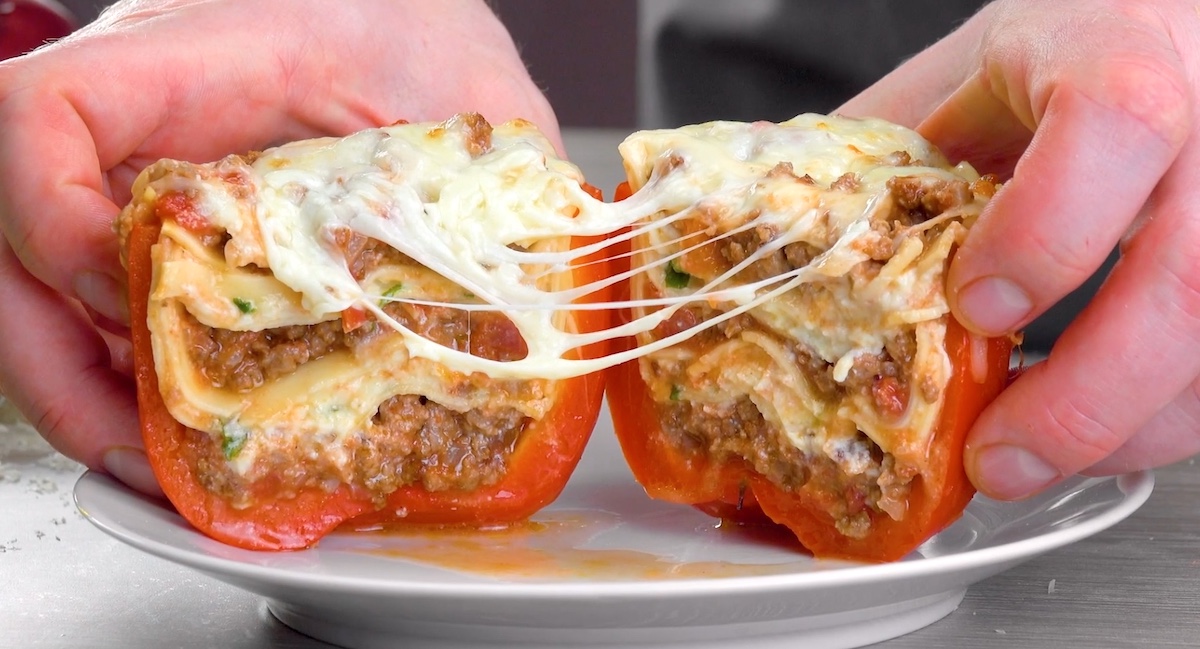 Cette recette combine deux classiques qui jouissent d’une grande popularité. Avis aux adeptes des poivrons farcis et amateurs de lasagnes ! On recouvre un mélange de viande hachée et de tomates avec des feuilles de lasagnes et de la ricotta dans un poivron. Agrémentée de beaucoup de fromage râpé, cette recette de mini lasagnes dans des poivrons va vous transporter au septième ciel !