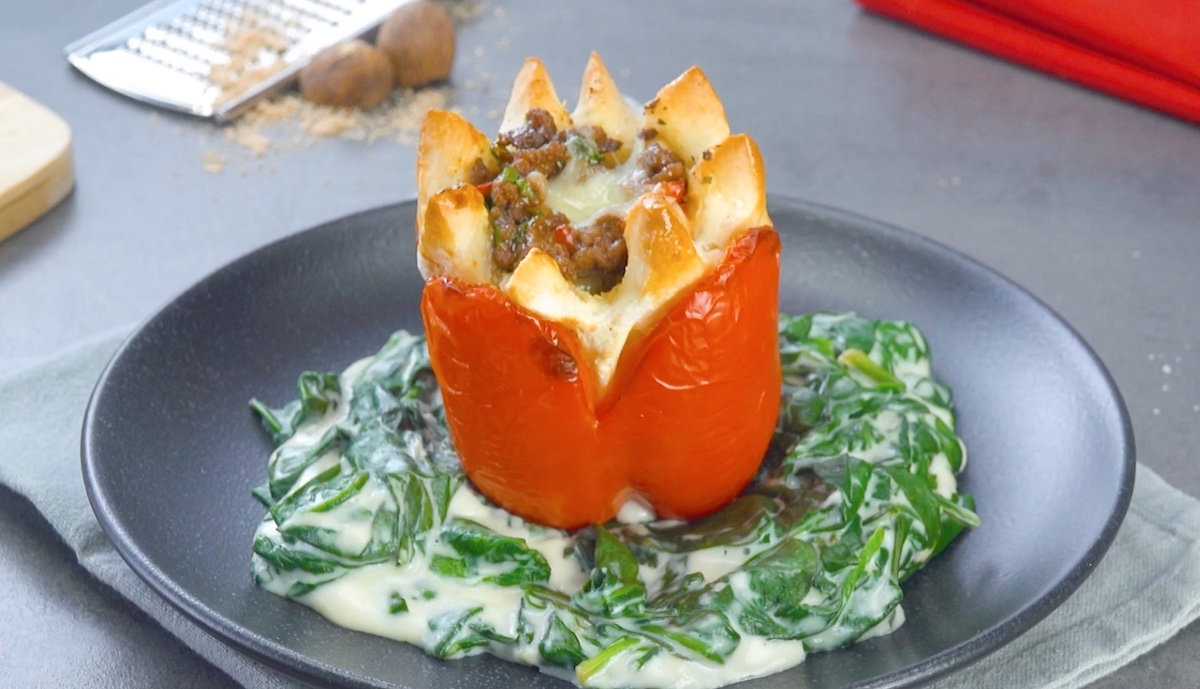Nous vous montrons aujourd’hui comment préparer le poivron farci différemment, plus précisément comme une fleur farcie ! Nous découpons le poivron en forme de fleur et le remplissons d’une boule de pâte à pizza farcie de viande hachée. Grâce à quelques coupures dans la pâte, la farce s’ouvre un peu au four, ce qui donne l’impression que le poivron est en fleur. Un poivron farci d’un autre genre.