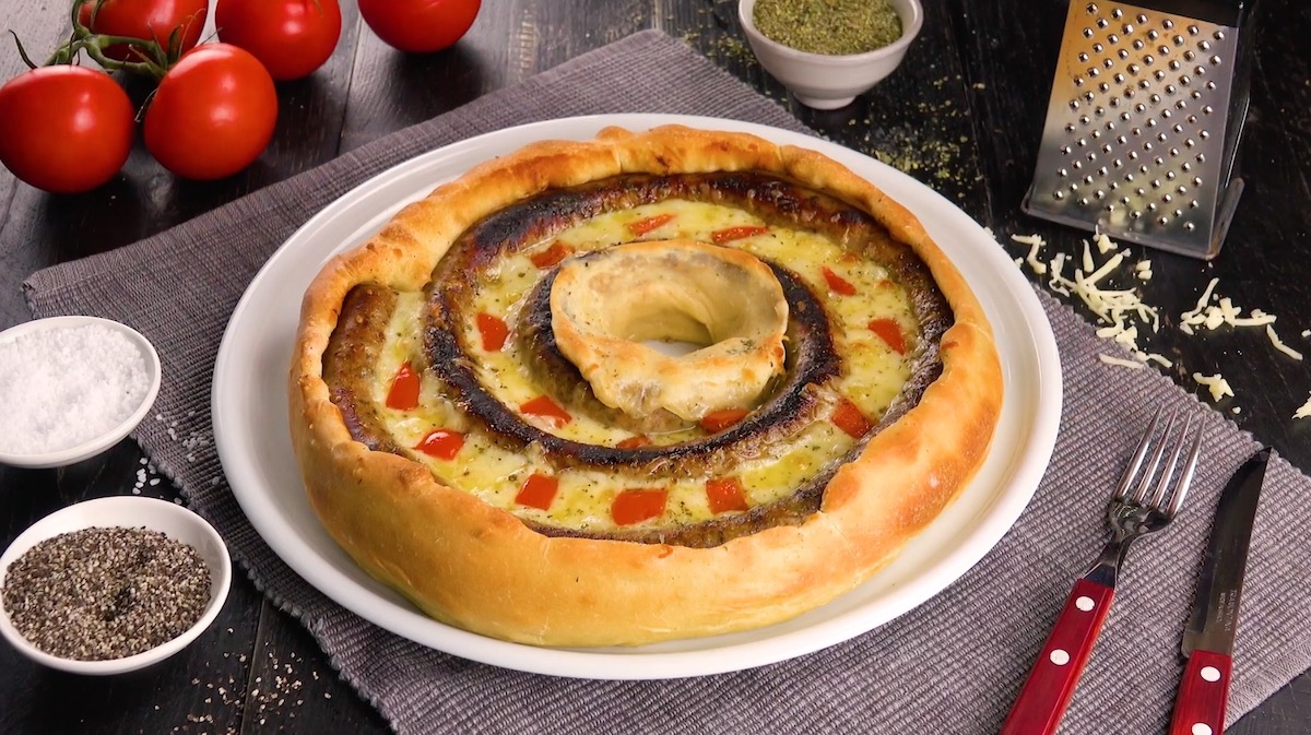 Vous êtes fan de pizza et de grillade ? Alors cette recette est faite pour vous : un escargot salé géant garni de saucisse, tomate et mozzarella. De quoi faire trembler vos papilles !