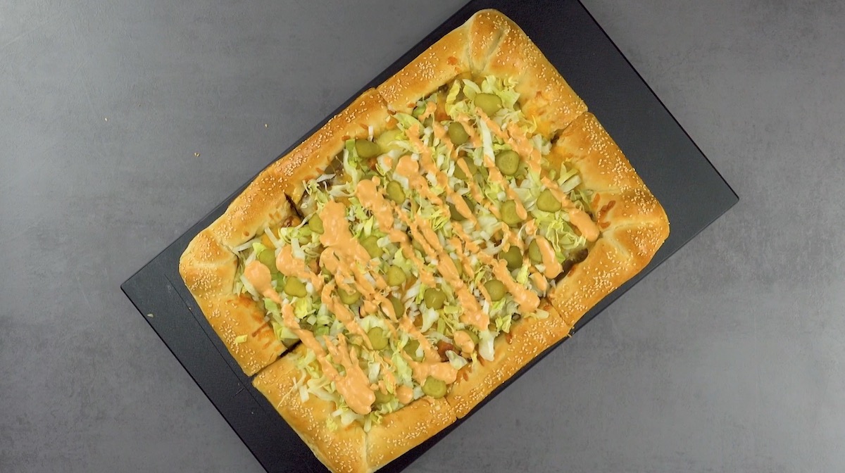 Envie d’une pizza ? Ou préférez-vous plutôt un bon hamburger ? Si vous n’arrivez pas à vous décider, qu’est-ce qui vous empêche de faire les deux ? Notre pizza burger a beaucoup d’arguments à faire valoir : fromage fondu, viande hachée XXL et sauce succulente !