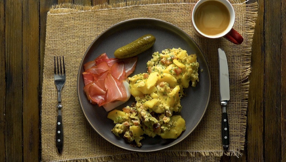 7.2) Battez les œufs avec le lait et la ciboulette et ajoutez-les au reste dans la poêle. Salez et poivrez. Laissez l’œuf durcir à feu doux pendant environ 7 à 10 minutes. Parfait avec des cornichons, du jambon de Forêt-Noire et un café avec du sucre et un trait de lait concentré.