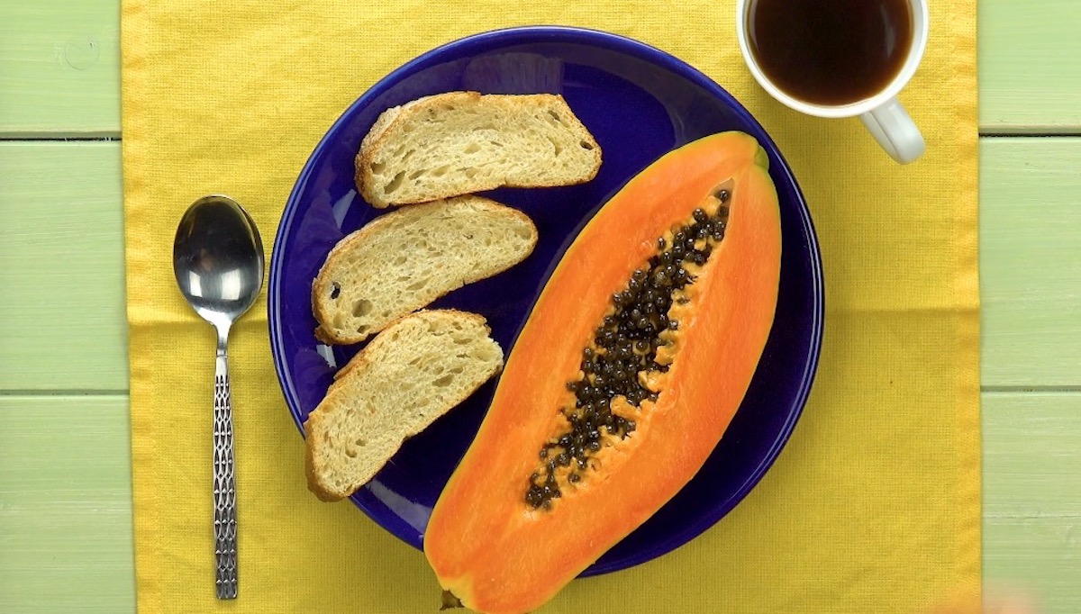 Coupez le pain blanc en tranches et une papaye en deux. Ajoutez une tasse de café et le petit-déjeuner brésilien est déjà prêt !