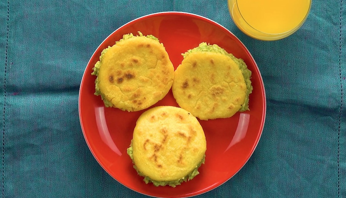 Dissolvez le sel dans l’eau et ajoutez graduellement la farine de maïs. Une fois la pâte formée, formez des boules de la même taille et aplatissez-les à la main. Faites chauffer de l’huile dans une poêle à feu vif et faites frire les arepas pendant 4 à 5 minutes de chaque côté. Tamponnez ensuite pour les sécher. Écrasez les avocats à la fourchette et assaisonnez-les de jus de citron vert, de sel et de poivre. Remplissez les arepas de crème d’avocat. Servez le tout avec un verre de jus d’orange.