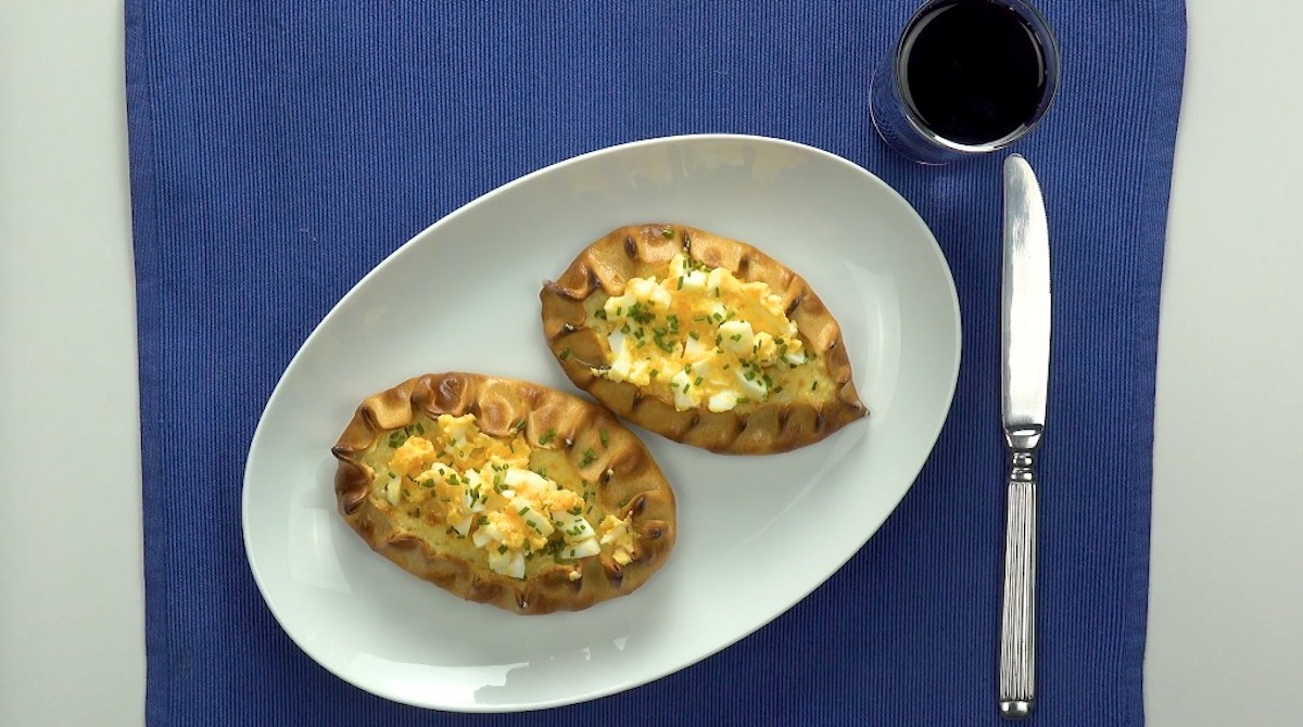 4.2) Pour la pâte, mélangez le sel et la farine avec l’eau et l’huile. Pétrissez la pâte avec vos mains. Ensuite, coupez la pâte en morceaux et étalez-les en petits cercles avec un rouleau à pâtisserie. Déposez une partie de la bouillie de riz sur la pâte et repliez-la. Enfournez les pirogues à 250 °C pendant 12 à 15 minutes. Quand ils sont cuits, badigeonnez-les de beurre liquide. Enfin, ajoutez un mélange d’œufs durs grossièrement hachés, de beurre mou, de sel et de ciboulette sur les tartes caréliennes.