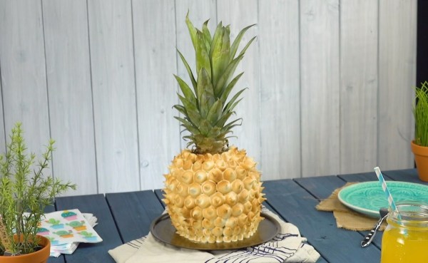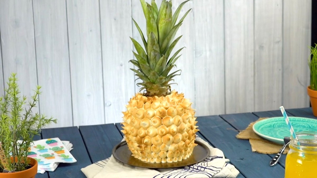- Sortez le gâteau du congélateur et coupez les bords pour lui donner la forme d'un ananas. Placez la tête d'ananas sur le dessus. Appliquez la crème meringuée avec une poche à douille et utilisez un décapeur thermique pour faire dorer les meringues.
