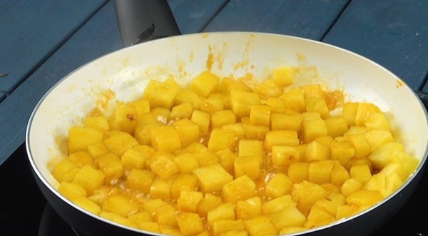 - Épluchez un ananas et coupez la moitié en petits dés. Faites chauffer le sucre glace dans une casserole et laissez-le caraméliser. Ajoutez les cubes d'ananas et laissez-les dorer. Mettez de côté.