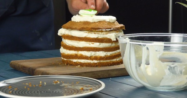 - Coupez le gâteau refroidi en 5 tranches horizontales. Superposez les couches en alternant gâteau, crème de mascarpone et cubes d'ananas caramélisés. Placez le gâteau au congélateur toute la nuit.