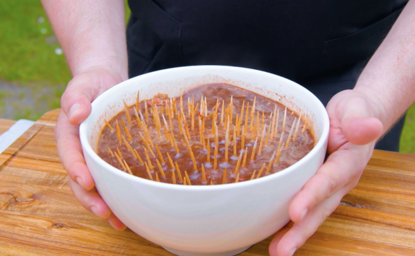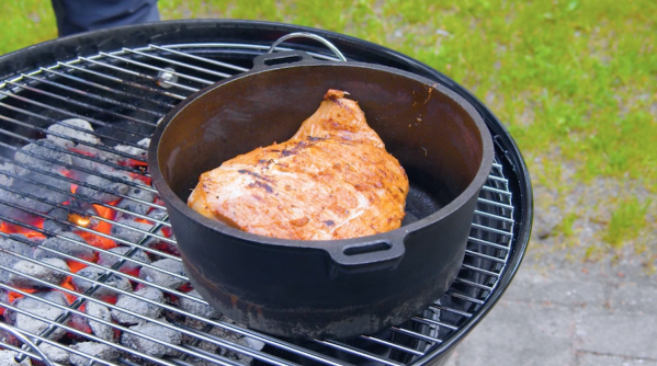- Retirez la viande du plat, n'oubliez pas de garder la marinade pour plus tard et retirez les cure-dents. Saisissez la viande à feu vif au barbecue. Placez-la ensuite dans une cocotte et laissez-la cuire lentement à chaleur indirecte pendant environ 3 à 4 heures. La température à cœur de la viande doit être supérieure à 90 °C afin qu'elle puisse être facilement découpée ou effilochée par la suite.