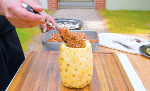 Vous cherchez une recette de grillades qui sort de l’ordinaire ? Les saucisses et les brochettes sont trop ennuyeuses pour vous ? Alors, soyez attentifs ! Voici une idée pour le barbecue dont vos invités parleront encore dans 10 ans. Nous remplissons un ananas de porc effiloché et de mozzarella pour ensuite l’envelopper de lard. Le tout complété par un glaçage à la sauce BBQ et accompagné d’épis de maïs grillés. En cette saison de grillades, c’est un incontournable pour tout fan de barbecue !