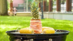 - Remettez le "couvercle" sur l'ananas et entourez-le complètement de lard. Répartissez le charbon en cercle sur le barbecue, posez la grille dessus et placez l'ananas au centre. Badigeonnez le lard de sauce BBQ. Faites également cuire les épis de maïs à chaleur indirecte et laissez cuire le tout pendant environ 15 minutes.
