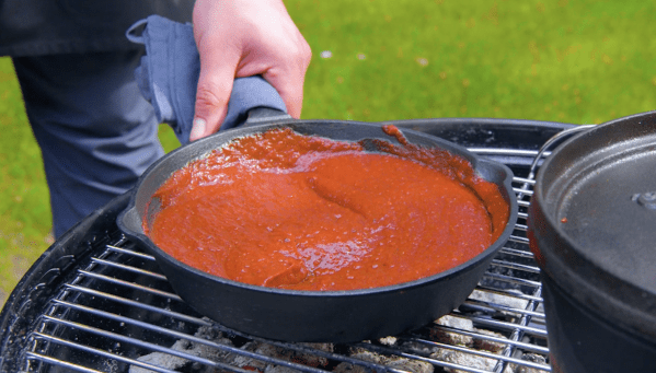 - Versez la marinade réservée dans une poêle en fonte et placez-la sur le barbecue. Laissez la marinade réduire jusqu'à ce qu'elle prenne la consistance d'un sirop. Ajoutez ensuite le concentré de tomates et le coulis de tomates. Faites cuire le tout jusqu'à ce que la sauce BBQ ait atteint la consistance souhaitée.
