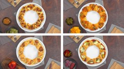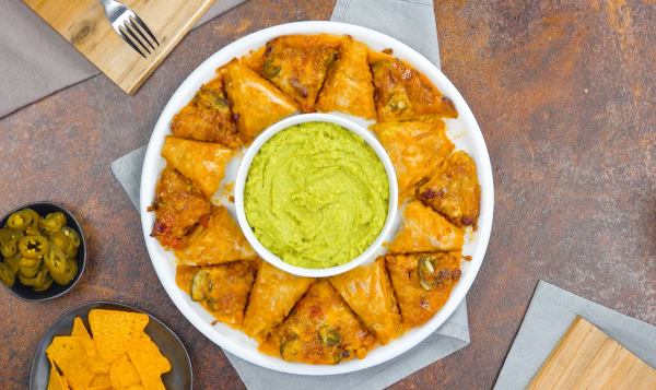 - Recouvrez la pâte feuilletée de chili con carne et répartissez du cheddar râpé et des jalapeños dessus. Retirez le saladier et découpez la partie non garnie de la pâte feuilletée en forme d'étoile à l'aide d'une roulette à pizza. Rabattez les triangles de pâte ainsi obtenus sur la garniture et appuyez sur les extrémités. Badigeonnez la pâte d'œuf battu et saupoudrez-la de mozzarella râpée. Enfournez l'anneau pendant environ 30 minutes à 180 °C. Pour servir, placez un bol de guacamole au centre de l'anneau façon tacos.