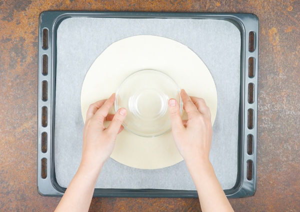 - Posez la pâte feuilletée sur une plaque recouverte de papier sulfurisé et placez un petit saladier à l'envers au milieu de la pâte.