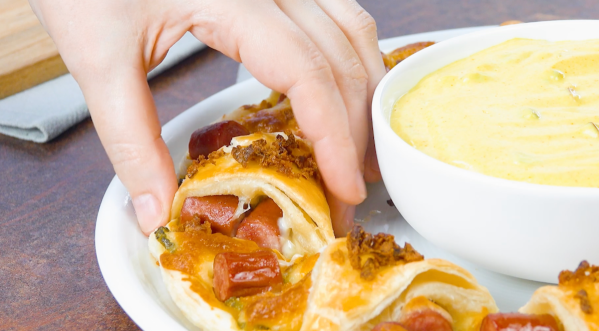 La pâte feuilletée est un produit polyvalent que l’on devrait toujours avoir dans son réfrigérateur. Une pâte feuilletée prête à l’emploi permet de réaliser les meilleurs plats en un rien de temps. Aujourd’hui, nous allons vous montrer comment transformer la pâte feuilletée en quatre délicieux anneaux garnis qui sont le snack parfait pour une soirée. Il y en a pour tous les goûts : une version pizza, hot-dog, tacos et même une version sucrée à la pomme. Tout simplement divin !